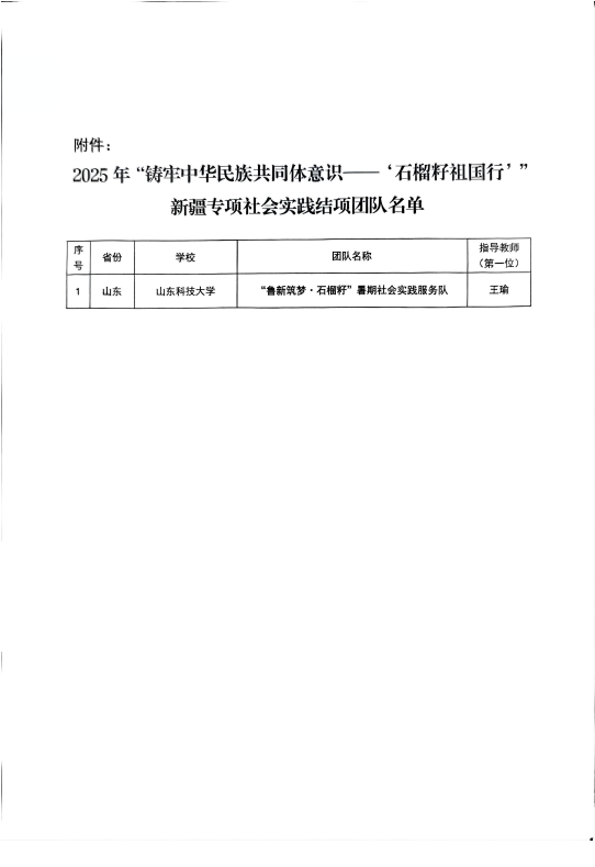 本次实践是共青团新疆区委开展的“铸牢中华民族共同体意识——‘石榴籽 祖国行’”新疆专项社会实践的重要组成部分。活动吸引了来自全国28个省市、182所高校的289支实践团队。在这样一场规模宏大、意义深远的实践中,MACAO·yl6776永利“鲁新筑梦·石榴籽”服务队以强烈的责任意识与真挚的服务情怀脱颖而出。